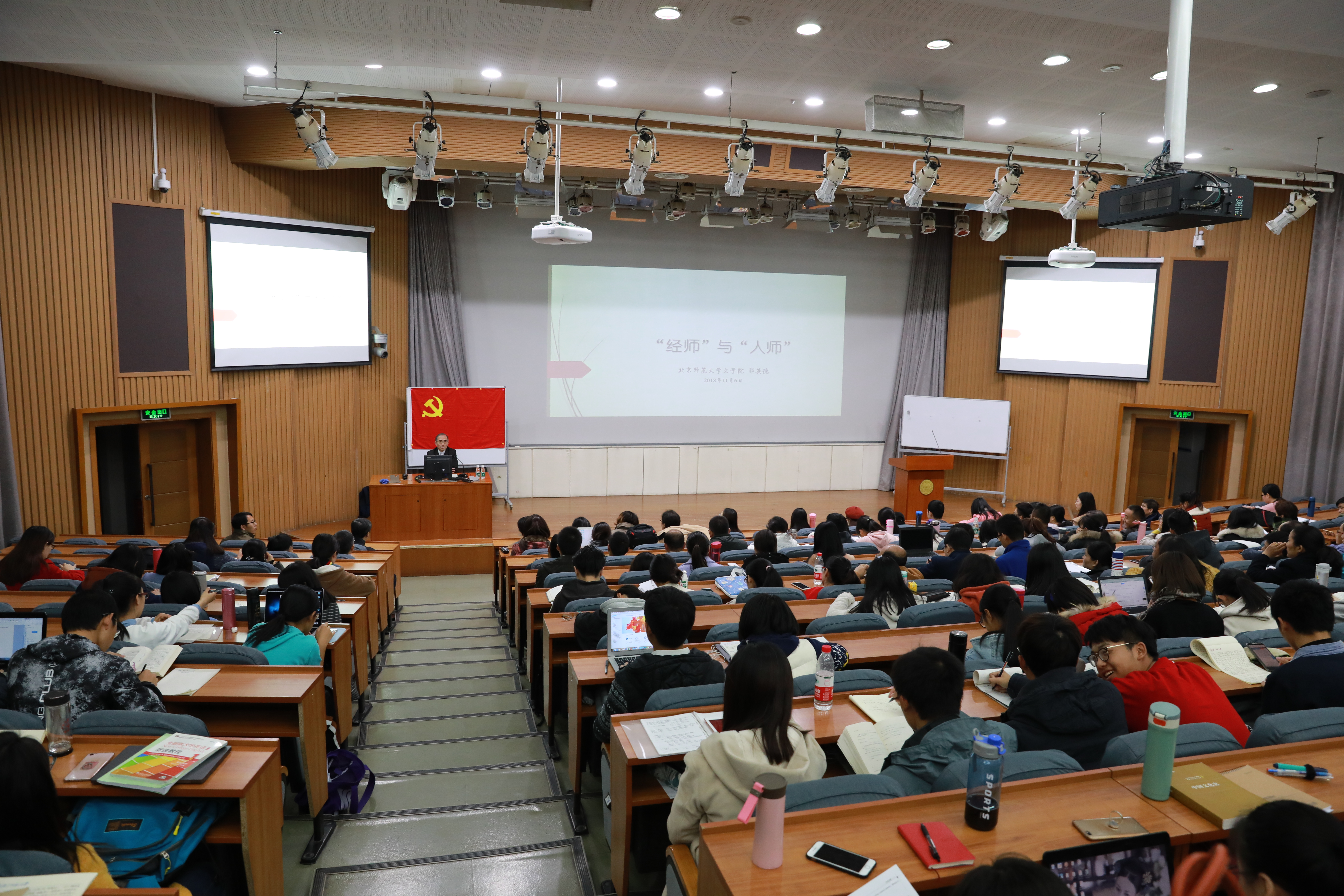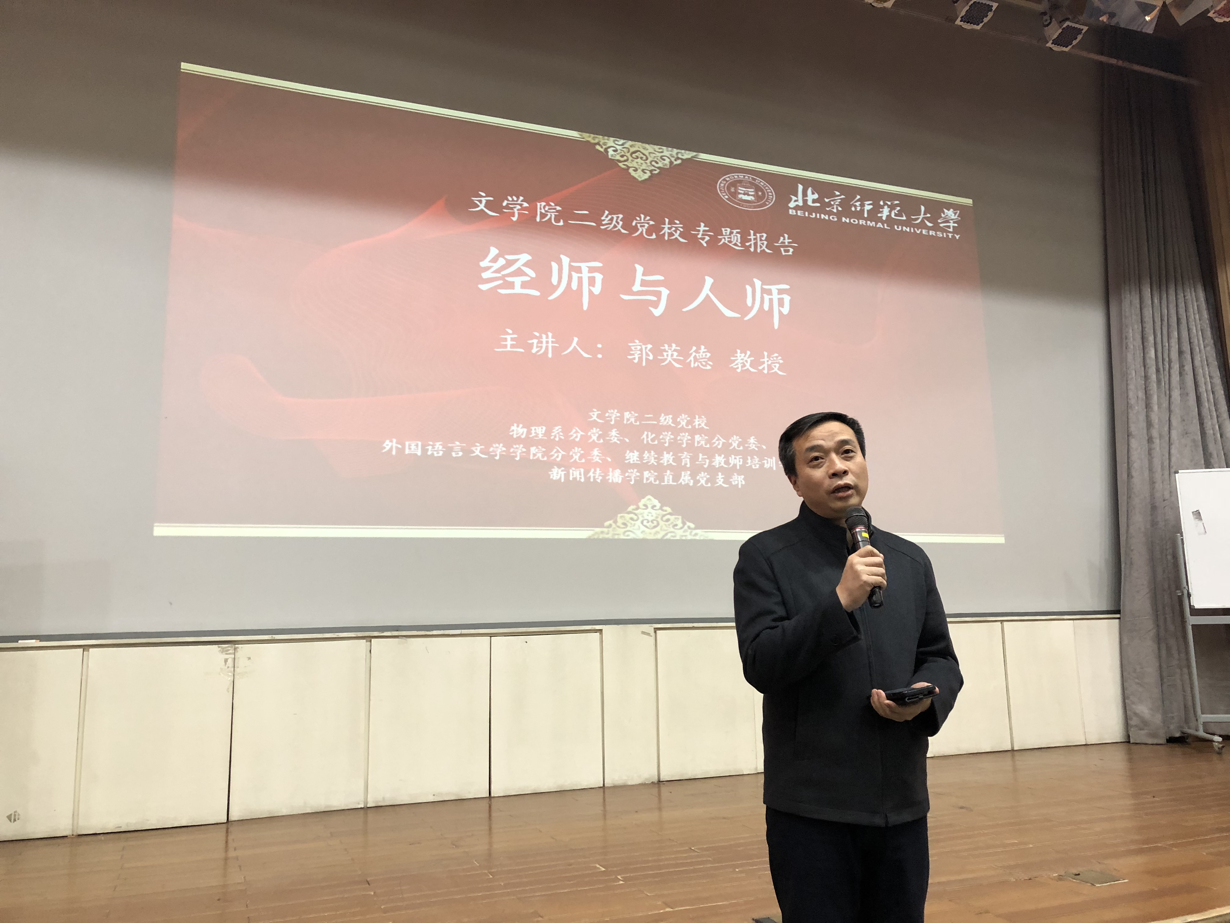 党委书记康震教授主持。 报告会上,郭英德教授从韩愈的《师说》讲起,围绕“说经师、说人师、说人”三个层次展开,旁征博引,层层深入,为大家细致辨析了“传知与传智”、“为己与为人”、“人与仁”等概念,让大家明白了古人所言“经师易遇,人师难遭”之深意。“人师”不仅是“授业解惑”的知识传授者,同时也是智慧的启迪者,更是“以身作则”的道德持守者。郭英德教授指出,在做好“经师”的前提下,每一位北师大人都应该以做一位“人师”为自己最高的追求,践行“学为人师,行为世范”的校训精神。 作为一个在北师大度过40年的北师大人,郭英德教授还总结了自己心中“北师大人”应有的品格。他指出,“北师大人”的称呼意味着质朴,像大地似的质朴;也意味着沉稳,如泰山般地沉稳;还意味着勤勉,勤勤恳恳的老黄牛,如诗人臧克家《老黄牛》诗中所写:“老牛亦解韶光贵,不等扬鞭自奔蹄。”“北师大人”的称呼更意味着淡泊,宛似温润洁净的和田玉,如古人所言“表里俱澄澈”,还兼具苏轼所说“也无风雨也无晴”的旷达,以及坦然坚韧的精神。郭英德教授强调,质朴、沉稳、勤勉、淡泊这些品格,就是北师大人做人的修养,也是北师大人行事的轨范。北师大培养出如启功先生、钟敬文先生、王梓坤校长、李小文院士等一大批优秀的学者、教育家,这些“北师大人”是我们北师大的脊梁,也成为一代又一代“北师大人”鞭策、激励自己前行的不竭动力。 整场报告会气氛热烈,郭英德教授带领大家深入思考了何为“人师”,何为“北师大人”应有的品格和气质,启发大家如何在实践中立德树人,如何成为一名“四有”好老师,进一步加深了师生党员对习近平总书记关于教师和教育重要论述的理解。