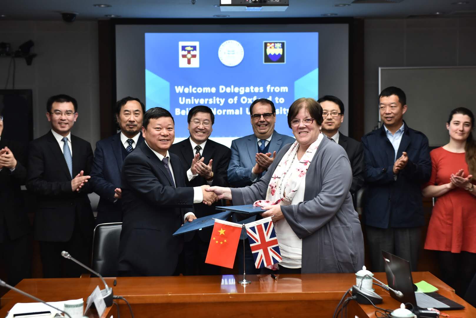 院长过常宝教授与英国牛津大学摄政学院学术主任Lynn Robson教授签署合作协议。双方同意在“全球视角下的文学及人文展现”主题下,联合举办文学活动和中英作家交流,组织两院师生进行学术和教育教学合作。北师大周作宇副校长、学校相关部门、国际写作中心,以及牛津大学有关学术机构负责人参加了协议签订仪式。双方商定,首次合作交流将于今年6月在牛津大学举行。