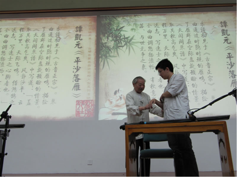 王立军教授,中国艺术研究院音乐研究所林晨、都本玲、周璐璐、翟风俭老师。 活动开始后,北师大松风琴社通过一段制作精美的视频,向大家介绍了古琴申遗成功六周年以来,全国部分高校琴社的成立、发展状况。全国高校琴社通过松风琴社,对“把遗产留给未来——古琴名家名曲进百校”系列活动表示祝贺,其中浙江中医院大学佩兰琴社为本次活动赠送了书画作品。另一段视频回顾林友仁先生为谭凯元指点演奏姿势了北师大松风琴社成立两周年以来的发展成果,松风琴社旨在推广与普及以古琴、萧和书法为代表的中国传统艺术,成立以来举办了许多深具影响力的大型活动。 本次活动采取由青年学子先上台弹奏,再由古琴大师进行点评和示范的形式。上半场先由松风琴社首任社长、大学生古琴音乐会发起人、脱衣秀