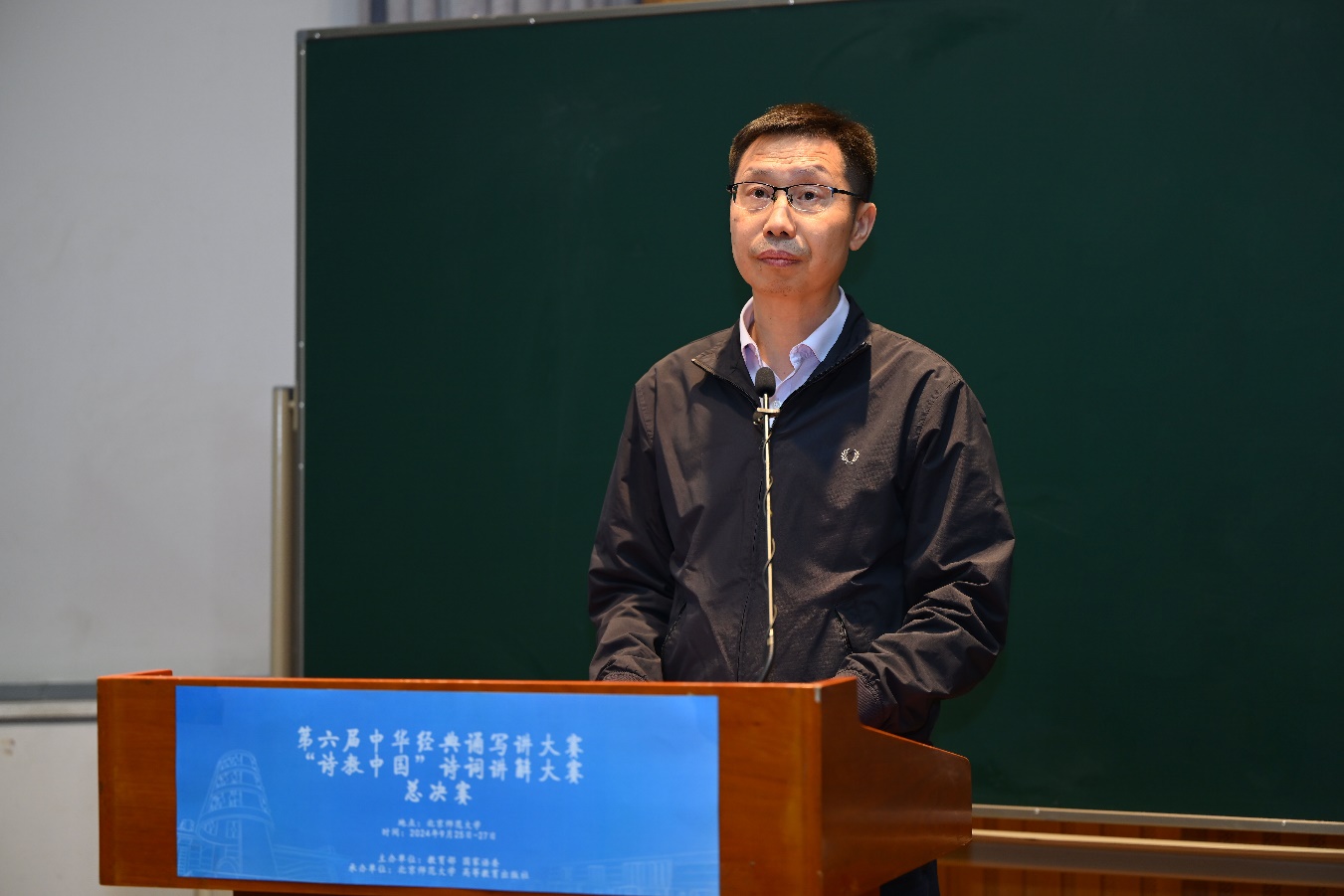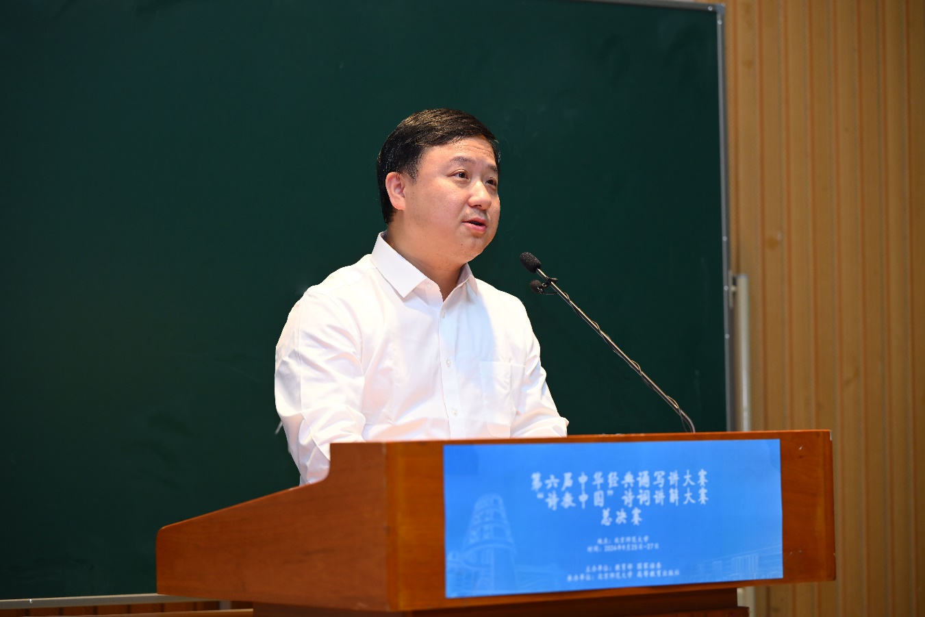 南山诗社表演 教育部语言文字应用管理司司长周为发表讲话并宣布总决赛正式开赛。周为指出,要深入贯彻党的二十届三中全会精神和全国教育大会精神,充分发挥语言文字在教育和文化领域中的基础作用。要通过大赛展示和提高教书育人能力,展示和增强文化自信,展示和提升中华文化影响力。将中华经典诵写讲大赛打造为更具实践价值、更显时代精神、更富文化内涵的响亮品牌,为加快建设教育强国和文化强国贡献“语言文字之力”。 图 3 教育部语言文字应用管理司司长周为讲话 语文出版社社长于春迟表示,“诗教中国”诗词讲解大赛是传承和发展中华优秀语言文化的重要平台。作为大赛执委会,语文出版社与各省教育行政部门和语委部门、承办单位紧密合作,积极协调各方资源,全力保障大赛顺利进行。本届大赛赛事紧张,竞争激烈,期待各位参赛选手在总决赛中发挥优势,展现风采。 图 4 语文出版社社长于春迟讲话 承办单位代表北京师范大学党委常委、副校长康震在发言中强调了中华优秀传统文化的重要性,指出经典诗词是中华文化的瑰宝,承载着历史记忆和民族情感。在“四有好老师”提出十周年之际,康震鼓励参赛者用生动的语言和真挚的情感去讲解诗词,让诗词在新时代焕发新的生命力,并表示将持续探索诗词教育的新模式、新路径,不断推动中华文化传承、发展与创新。 图 5 北京师范大学党委常委、副校长康震致辞 承办单位代表高等教育出版社总编辑谭方正表示,中国古典诗词是优秀传统文化的精华,诗词教育对培育新时代文化建设人才尤为重要。高等教育出版社作为教育出版的“国家队”,将以本次与北京师范大学同心协力举办大赛为契机,进一步传承弘扬中华优秀文化,助力教育强国和文化强国建设。 图 6 高等教育出版社总编辑谭方正致辞 广东省教育厅语委办副主任张伟民作为赛区代表,分享了广东省组织大赛的经验:一是高度重视,提前规划,打造特色活动;二是统筹部署,形成协调沟通机制;三是提高作品质量,组织专业培训和指导;四是营造氛围,夯实基础,通过大赛选树传承中华优秀语言文化的代表人物。张伟民副主任表示,在未来将持续打造诗词教育品牌活动,助力语言文字工作再上新台阶。 “诗教中国”诗词讲解大赛是教育部、国家语言文字工作委员会主办的中华经典诵写讲大赛的组成赛事之一,至今已举办五届。为贯彻落实党的二十大精神,服务教育强国、文化强国建设,加大国家通用语言文字推广力度,传承发展中华优秀语言文化,第六届中华经典诵写讲大赛“诗教中国”诗词讲解大赛以传承弘扬中华优秀传统文化、深化“典耀中华”主题读书行动为主题,旨在充分挖掘中华经典诗词中所蕴含的民族正气、爱国情怀、道德品质和艺术魅力。本届大赛,全国共有40157人报名,参与测评96963次,历经初赛、复赛、半决赛等环节,共选出来自全国的290余名选手参加总决赛。小学教师组、中学教师组、大学教师组、大学生组、留学生组等各组选手将围绕中华经典诗词的课堂教学和讲解展开角逐。相信本届大赛将引领全社会更深入地体悟中华优秀文化内涵,丰富文化思想实践,提升语言文化素养,激发文化自信自强。 图 8 总决赛启动仪式合影